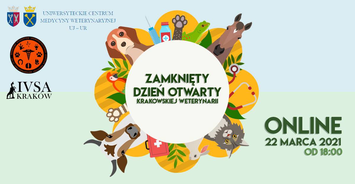 Samorząd Studentów Uniwersyteckiego Centrum Medycyny Weterynaryjnej UJ-UR oraz IVSA Kraków zapraszają Was na organizowany wraz z Uniwersytetem Rolniczym im. Hugona Kołłątaja w Krakowie „Zamknięty Dzień Otwarty” promujący studia weterynaryjne. Spotkanie odbędzie się 22 marca 2021 o godz. 18.00 na platformie ClickMeeting.