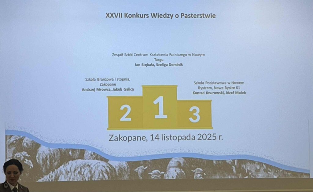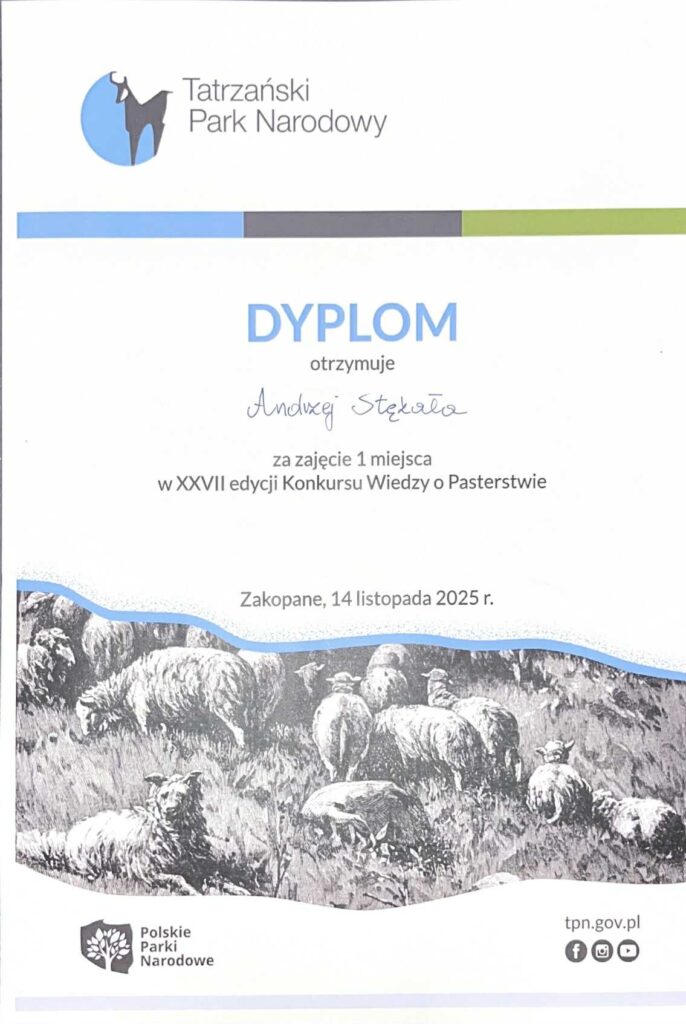 14 listopada uczniowie naszej szkoły: Andrzej Stękała i Dominik Szeliga z klasy V technikum kształcącego w zawodzie technik agrobiznesu wzięli udział w Konkursie Wiedzy o Pasterstwie, który odbył się na terenie Tatrzańskiego Parku Narodowego w Zakopanem. Celem konkursu było promowanie tradycji pasterskiej, góralskiej kultury oraz ochrony dziedzictwa przyrodniczego i kulturowego Tatr. Z dumą informujemy, że nasi reprezentanci zdobyli I miejsce. To stanowi dla nas wyjątkowe wyróżnienie i piękne potwierdzenie, że duch góralskiej tradycji wciąż silnie żyje wśród młodych. Serdecznie gratulujemy naszym uczniom oraz dziękujemy organizatorom za stworzenie wydarzenia, które tak harmonijnie łączy wiedzę, tradycję i pasterskie dziedzictwo.