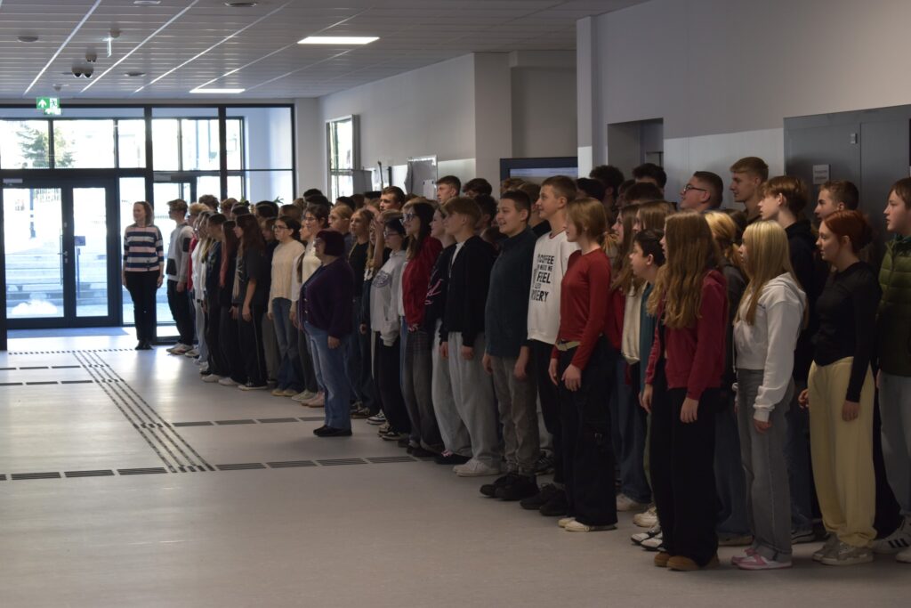 Dnia 7 listopada w naszej szkole odbyło się uroczyste odśpiewanie „Mazurka Dąbrowskiego” w ramach ogólnopolskiej akcji „Szkoła do Hymnu”. O wyznaczonej godzinie cała społeczność szkolna – uczniowie, nauczyciele oraz pracownicy szkoły – zgromadzili się, aby wspólnie uczcić Narodowe Święto Niepodległości. Uroczystość przebiegła w podniosłej i pełnej szacunku atmosferze, a wspólne śpiewanie stało się okazją do wyrażenia postawy patriotycznej oraz przypomnienia wartości, jakie wiążą się z wolnością i niepodległością Polski.