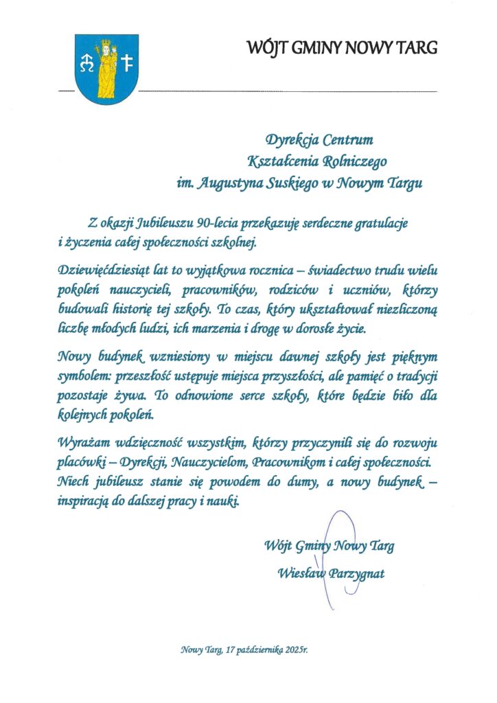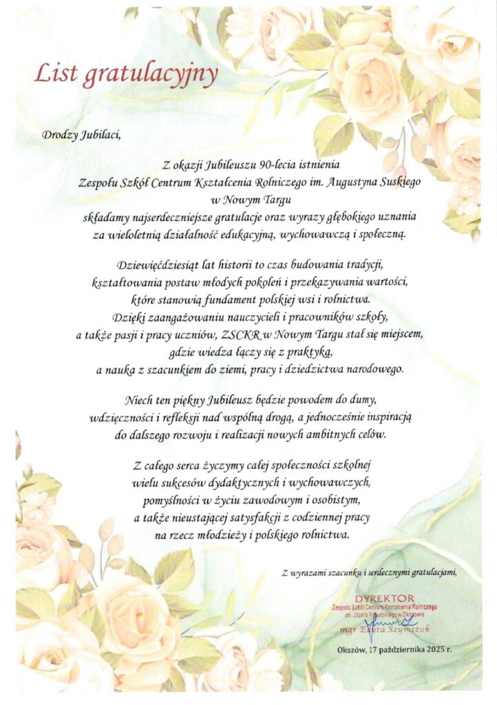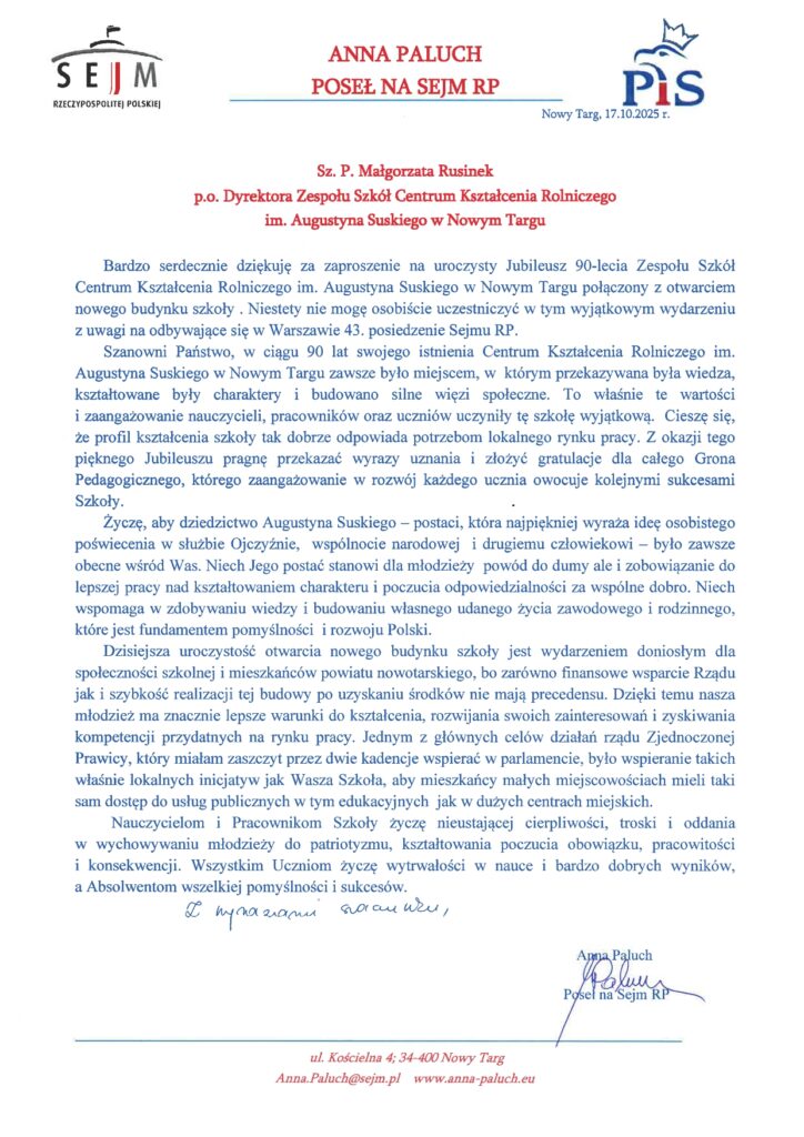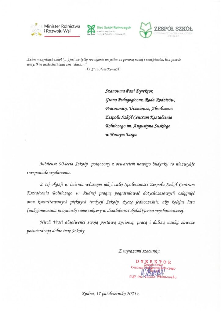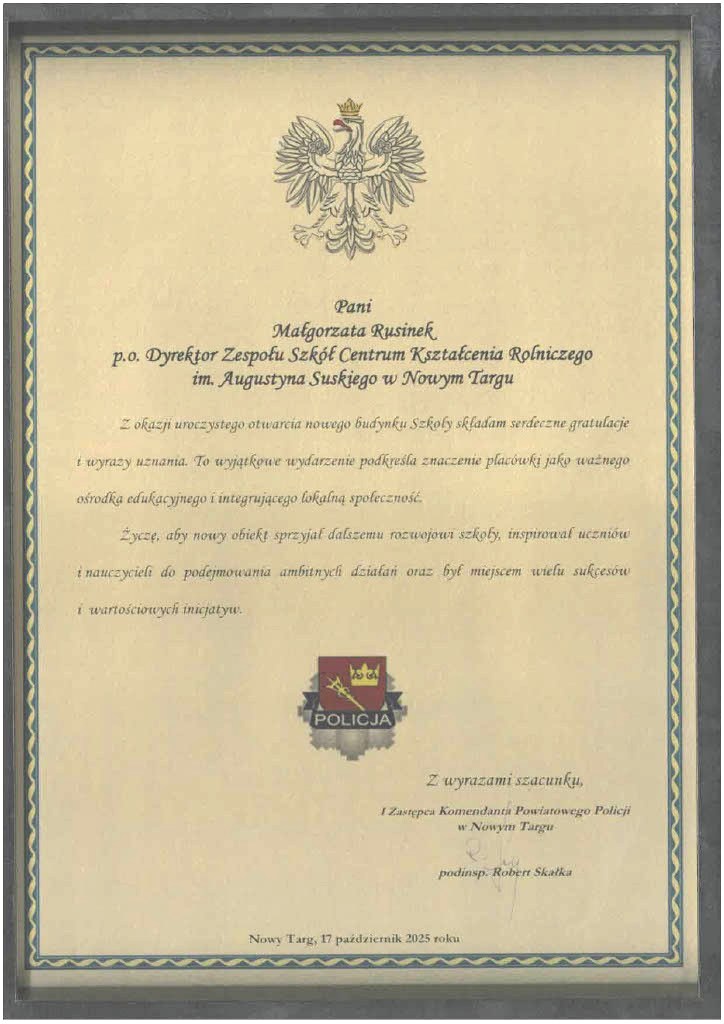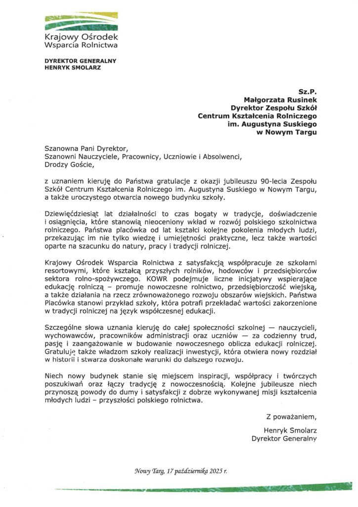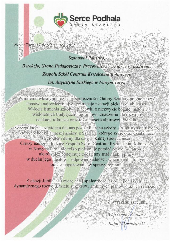 17 października br. w Zespole Szkół Centrum Kształcenia Rolniczego im. Augustyna Suskiego w Nowym Targu odbyła się wyjątkowa uroczystość – oficjalne otwarcie nowego budynku szkoły połączone z obchodami Jubileuszu 90-lecia jej istnienia. Był to niezwykle ważny i wzruszający dzień zarówno dla uczniów, nauczycieli, absolwentów, jak i całej lokalnej społeczności oraz przyjaciół szkoły.