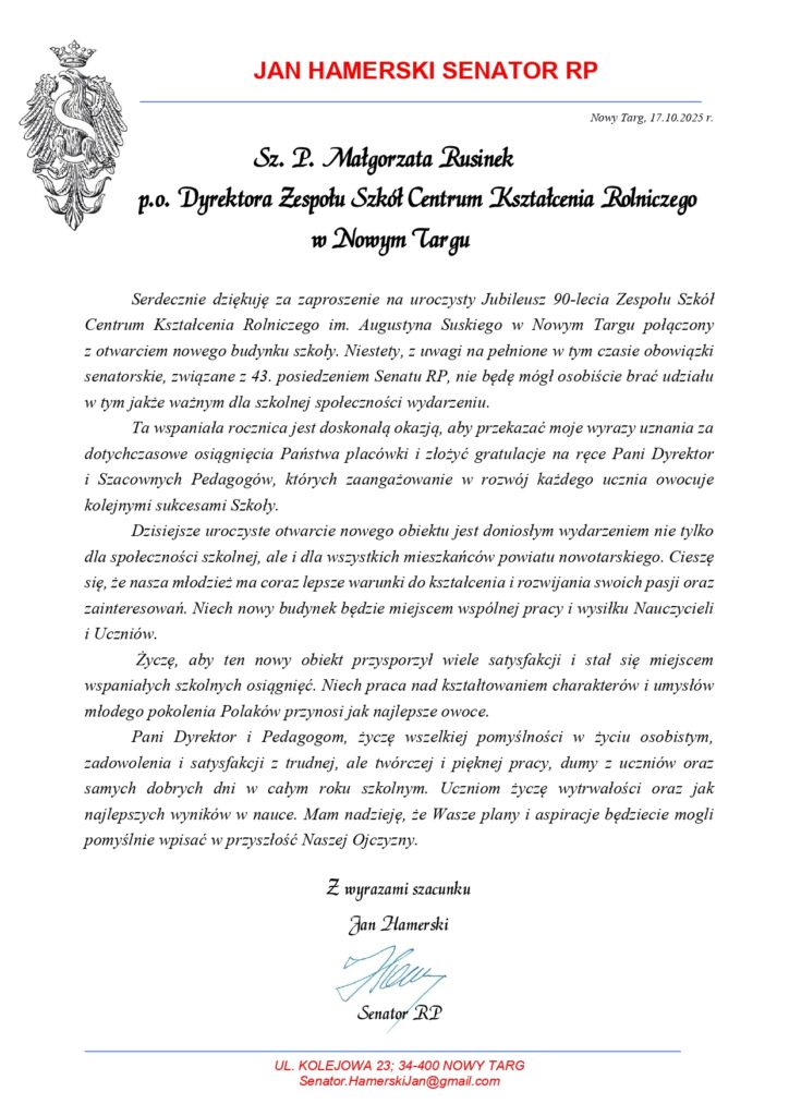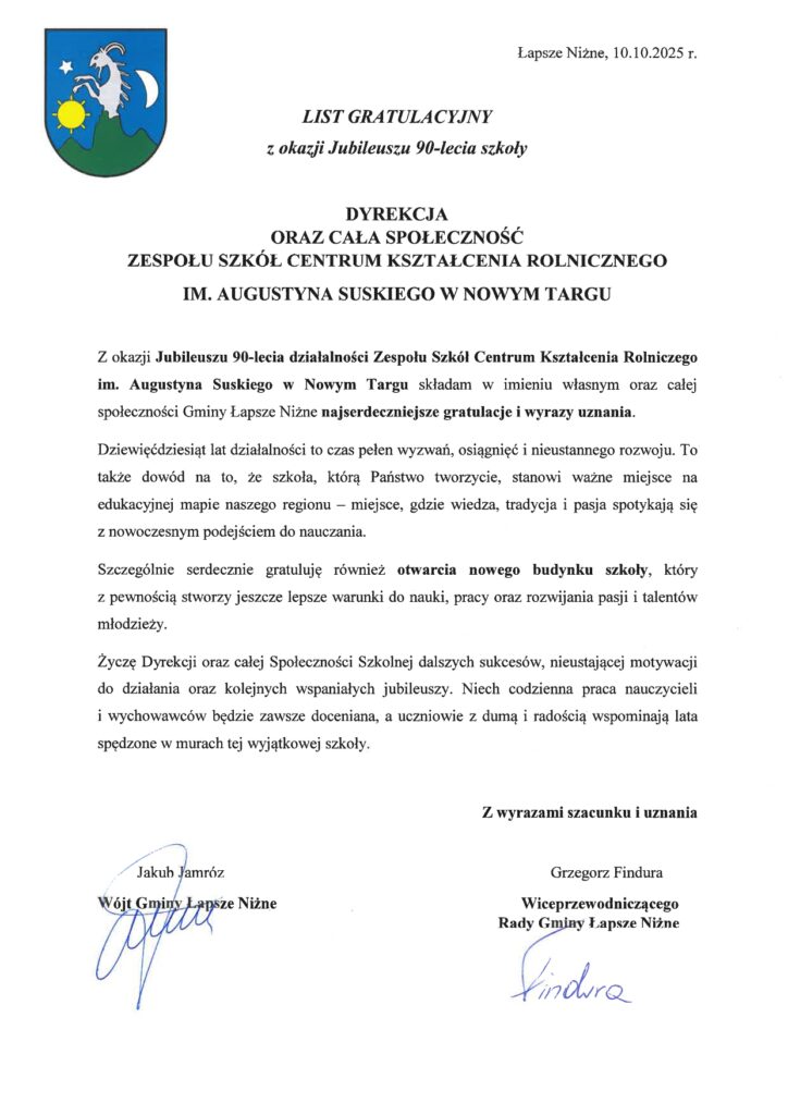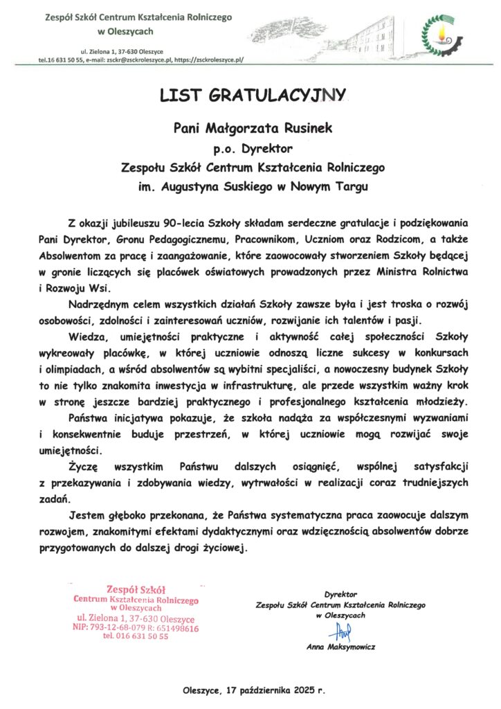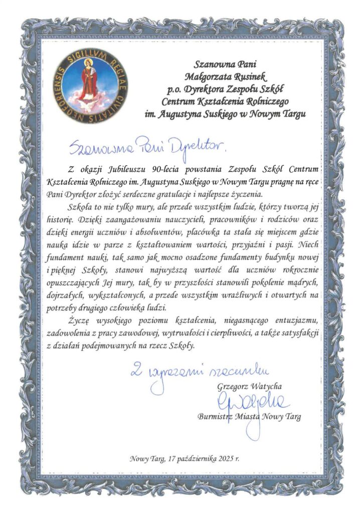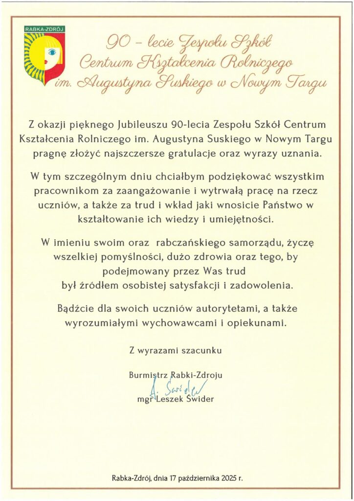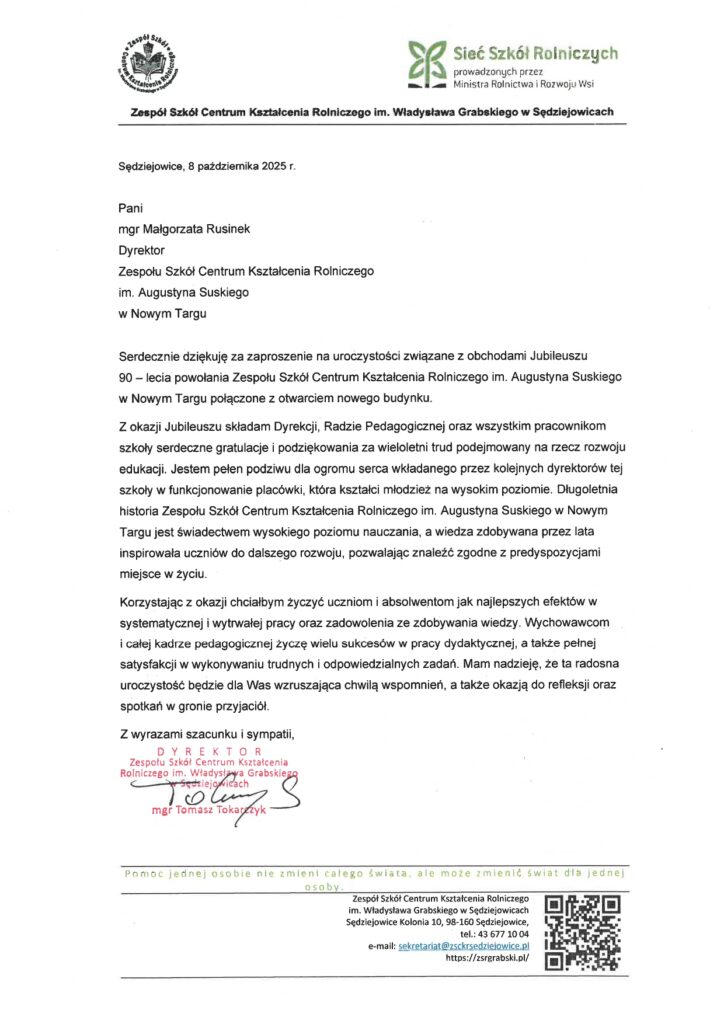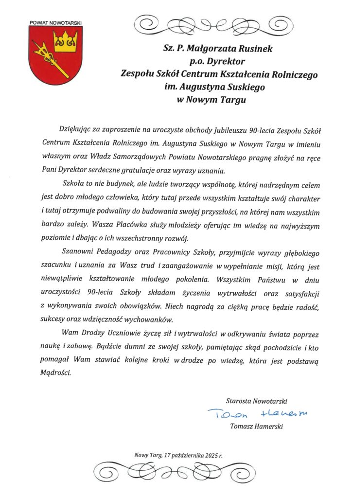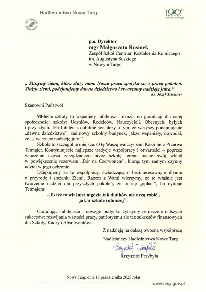 17 października br. w Zespole Szkół Centrum Kształcenia Rolniczego im. Augustyna Suskiego w Nowym Targu odbyła się wyjątkowa uroczystość – oficjalne otwarcie nowego budynku szkoły połączone z obchodami Jubileuszu 90-lecia jej istnienia. Był to niezwykle ważny i wzruszający dzień zarówno dla uczniów, nauczycieli, absolwentów, jak i całej lokalnej społeczności oraz przyjaciół szkoły.
