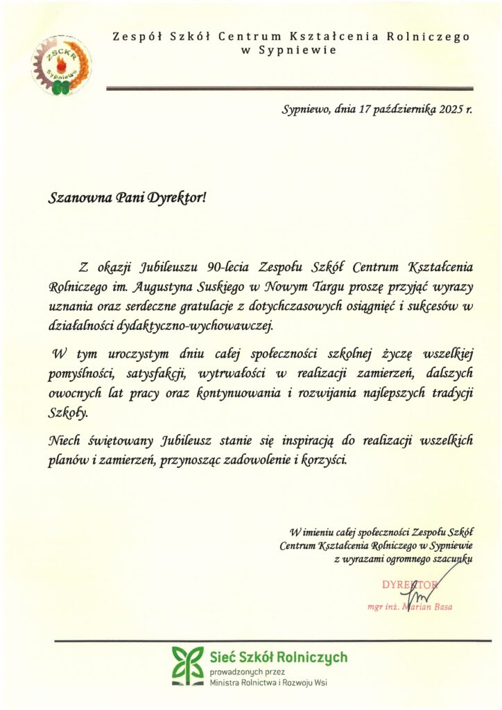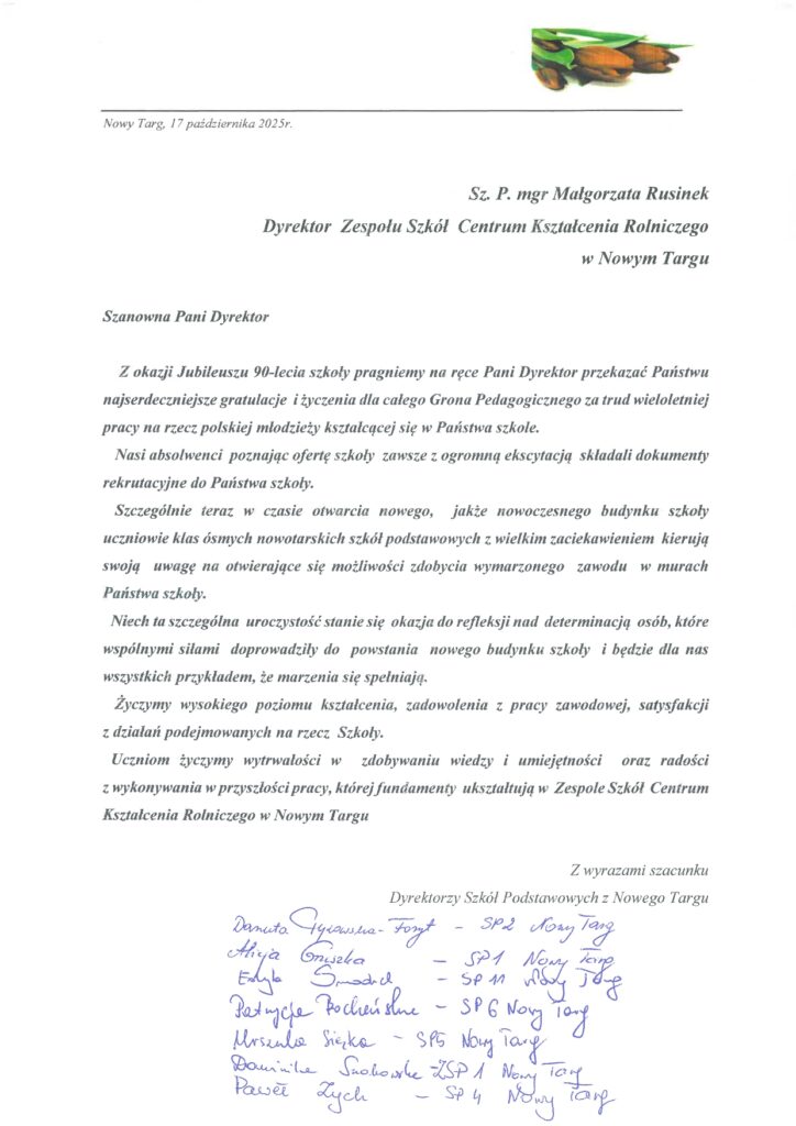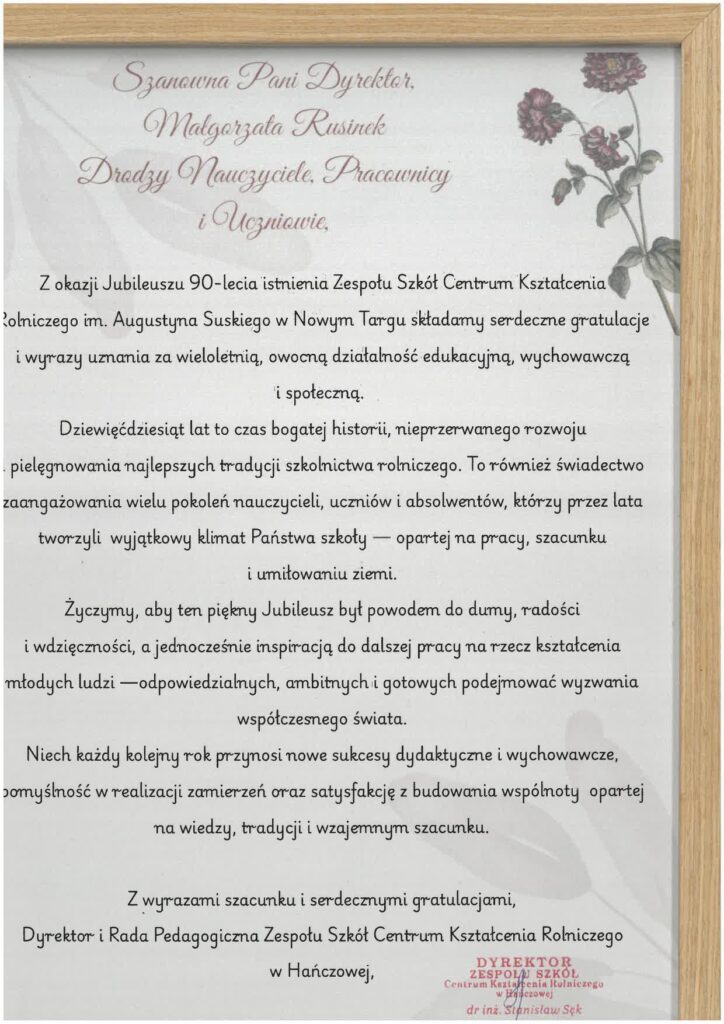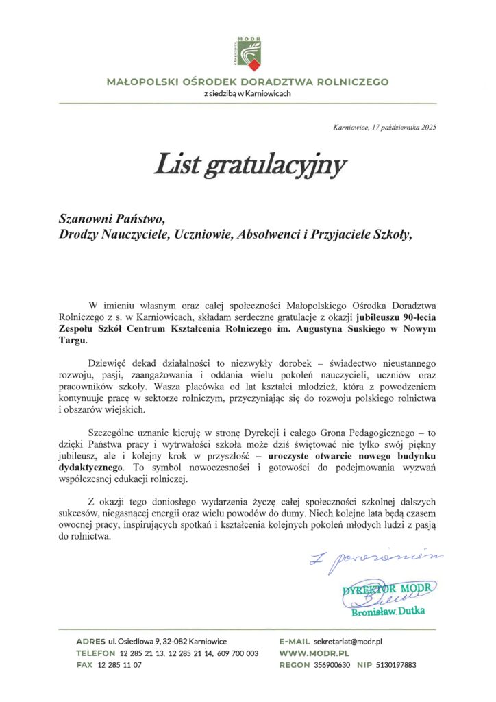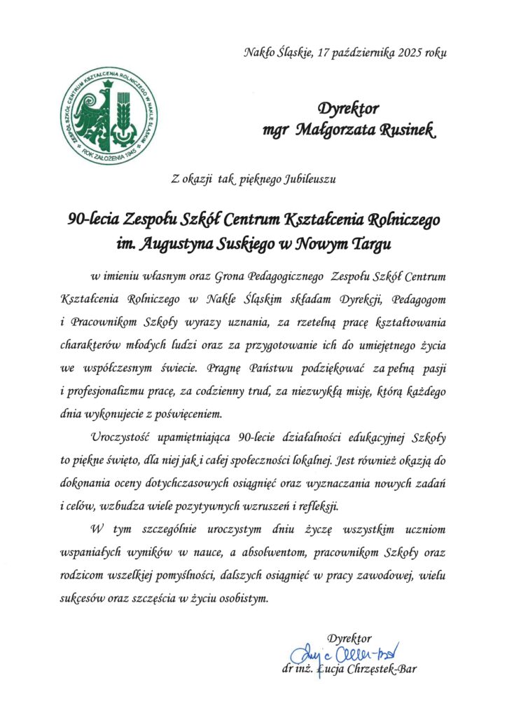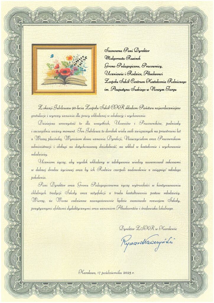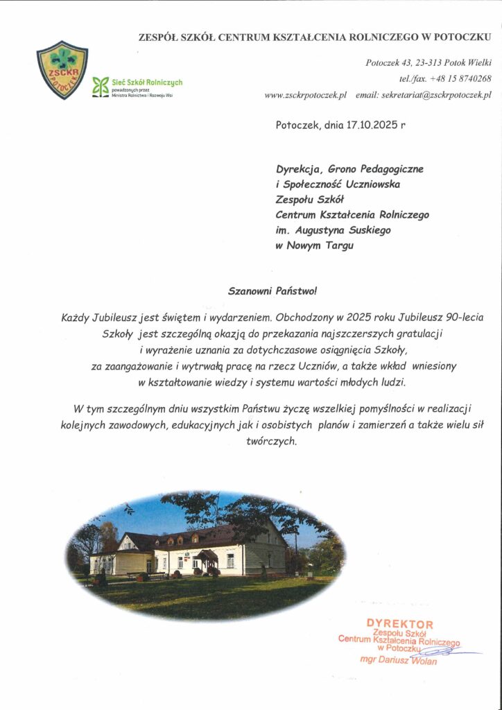 17 października br. w Zespole Szkół Centrum Kształcenia Rolniczego im. Augustyna Suskiego w Nowym Targu odbyła się wyjątkowa uroczystość – oficjalne otwarcie nowego budynku szkoły połączone z obchodami Jubileuszu 90-lecia jej istnienia. Był to niezwykle ważny i wzruszający dzień zarówno dla uczniów, nauczycieli, absolwentów, jak i całej lokalnej społeczności oraz przyjaciół szkoły.