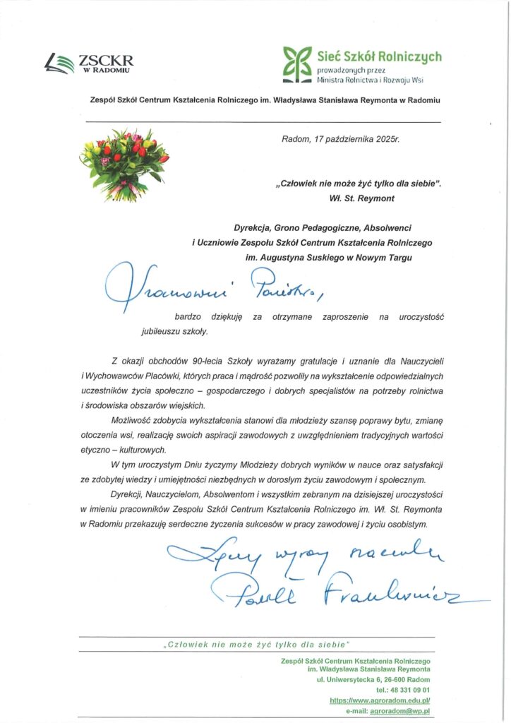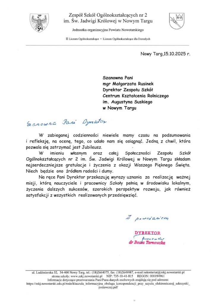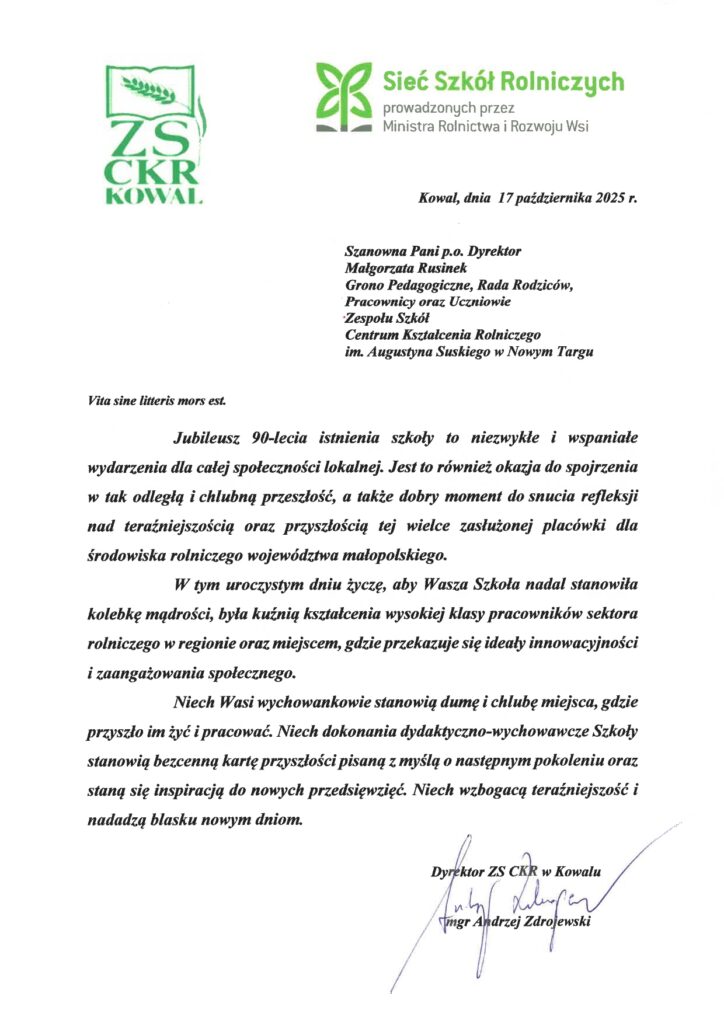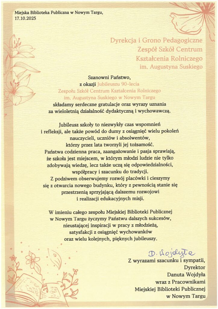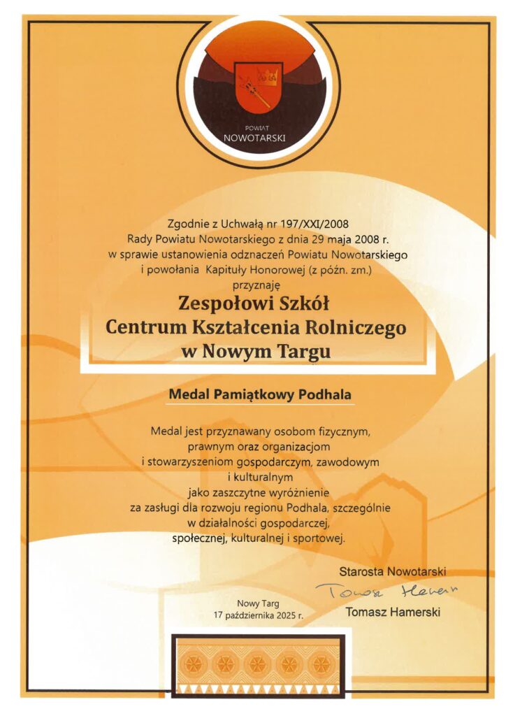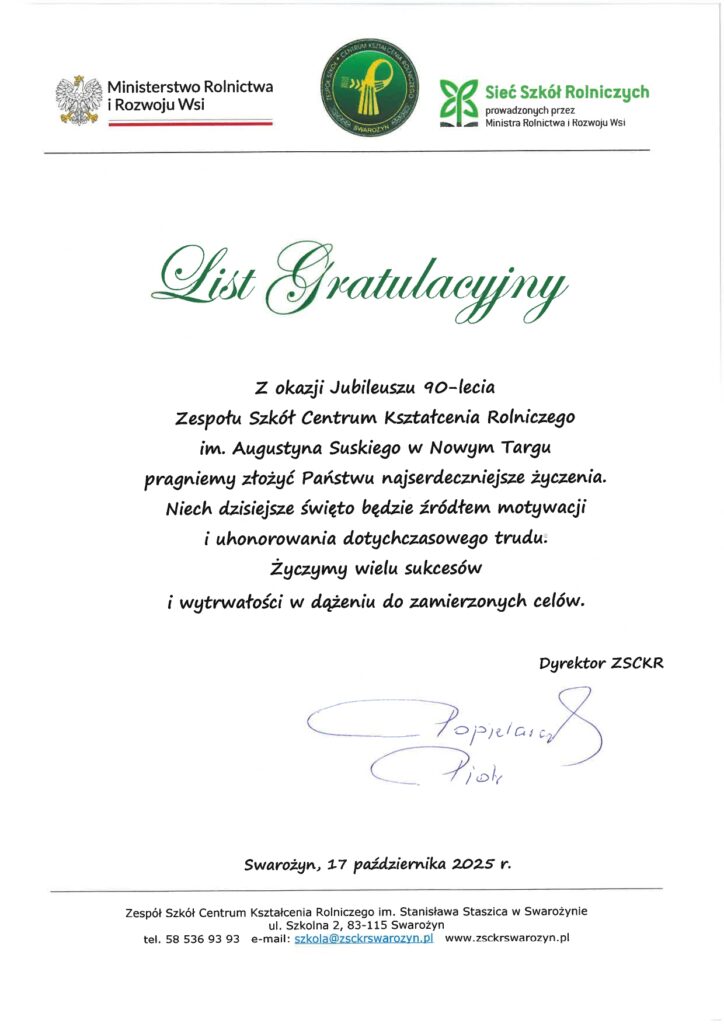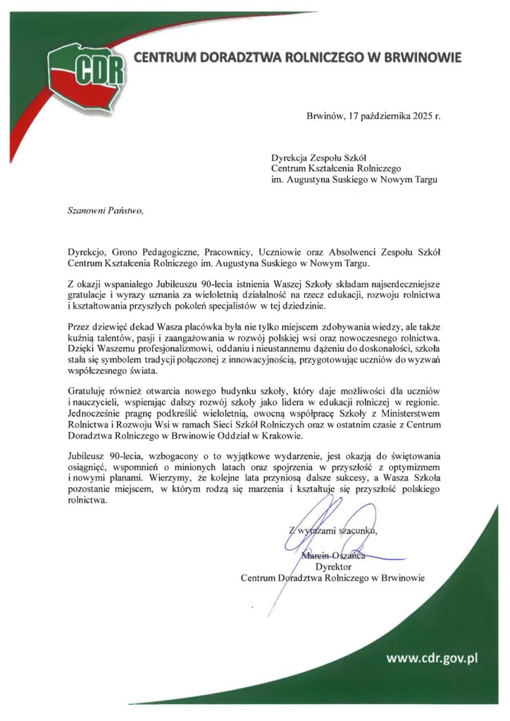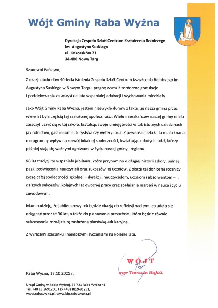 17 października br. w Zespole Szkół Centrum Kształcenia Rolniczego im. Augustyna Suskiego w Nowym Targu odbyła się wyjątkowa uroczystość – oficjalne otwarcie nowego budynku szkoły połączone z obchodami Jubileuszu 90-lecia jej istnienia. Był to niezwykle ważny i wzruszający dzień zarówno dla uczniów, nauczycieli, absolwentów, jak i całej lokalnej społeczności oraz przyjaciół szkoły.