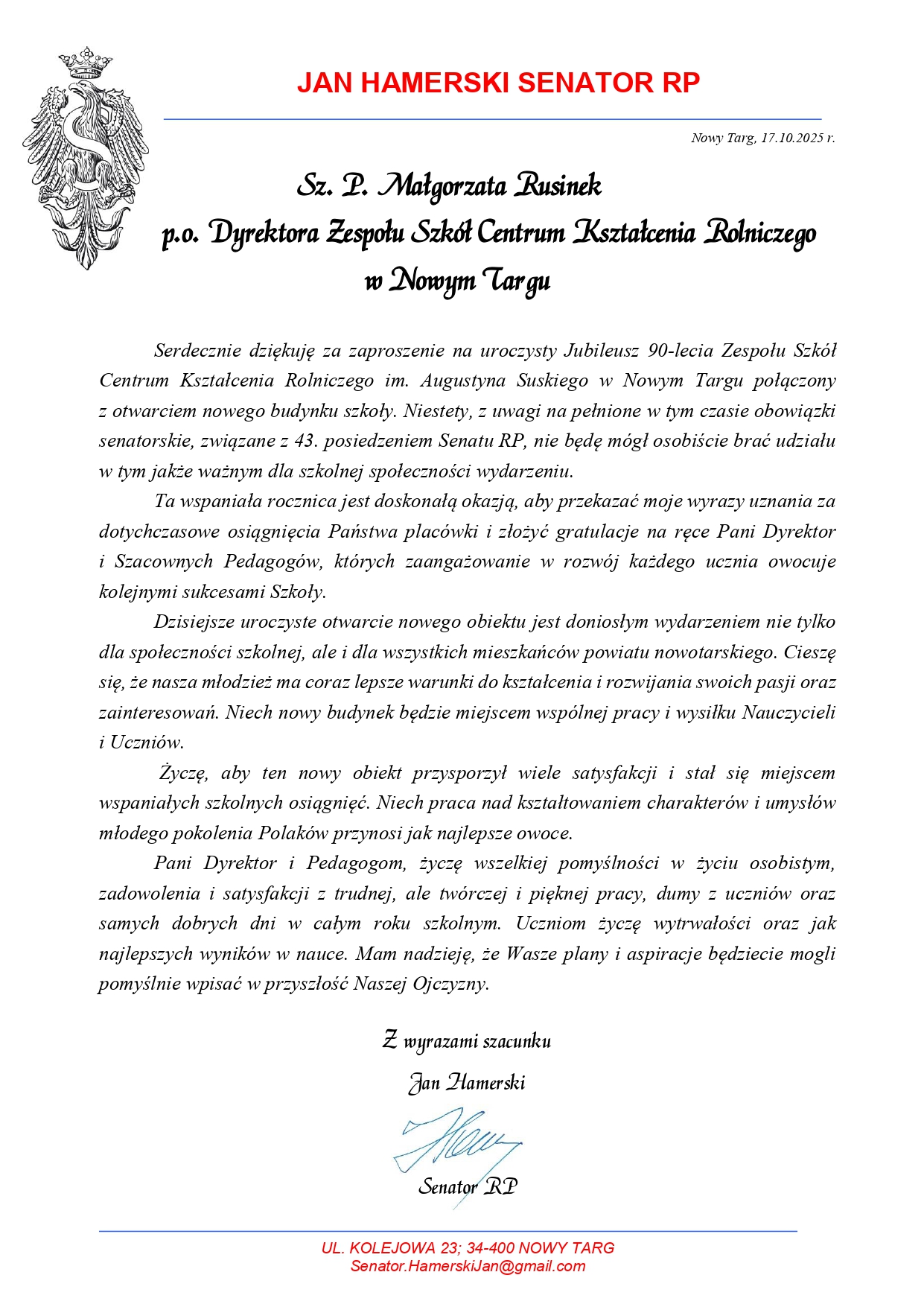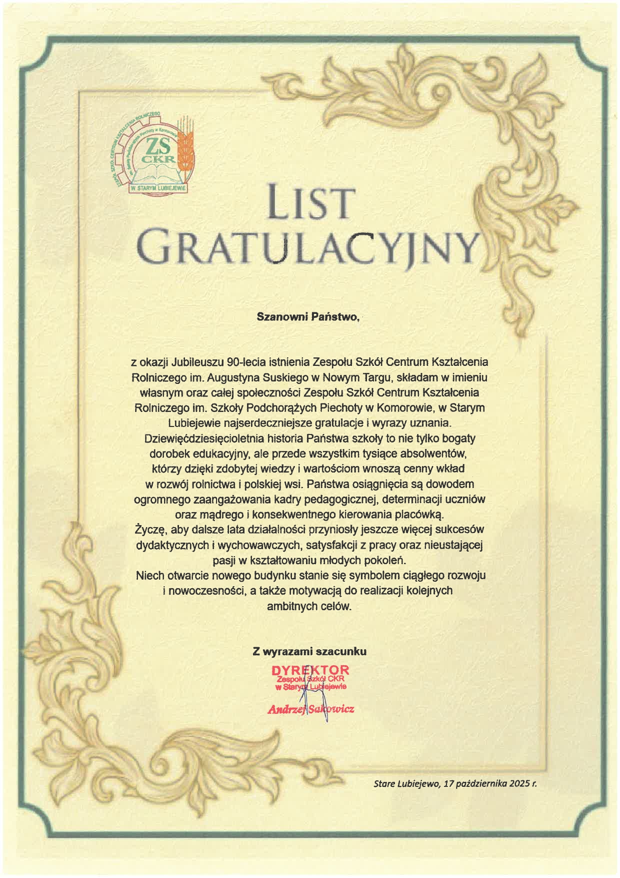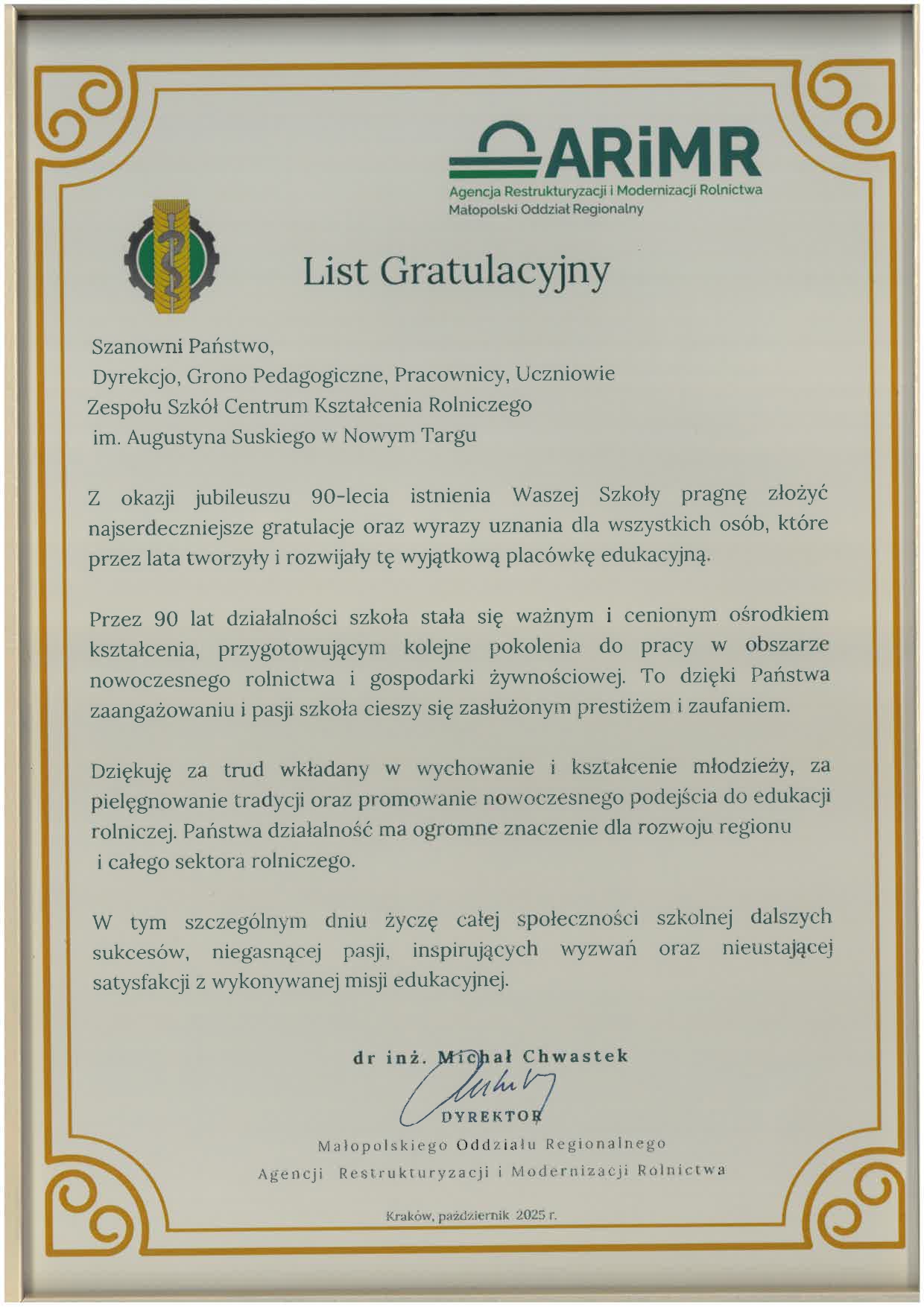 17 października br. w Zespole Szkół Centrum Kształcenia Rolniczego im. Augustyna Suskiego w Nowym Targu odbyła się wyjątkowa uroczystość – oficjalne otwarcie nowego budynku szkoły połączone z obchodami Jubileuszu 90-lecia jej istnienia. Był to niezwykle ważny i wzruszający dzień zarówno dla uczniów, nauczycieli, absolwentów, jak i całej lokalnej społeczności oraz przyjaciół szkoły.