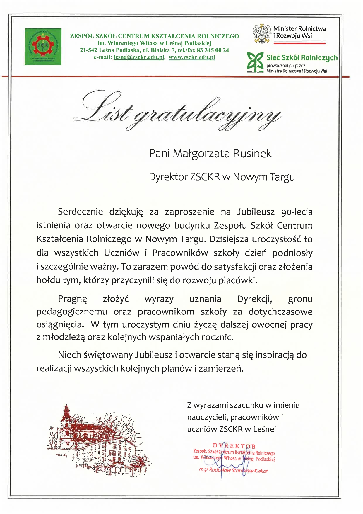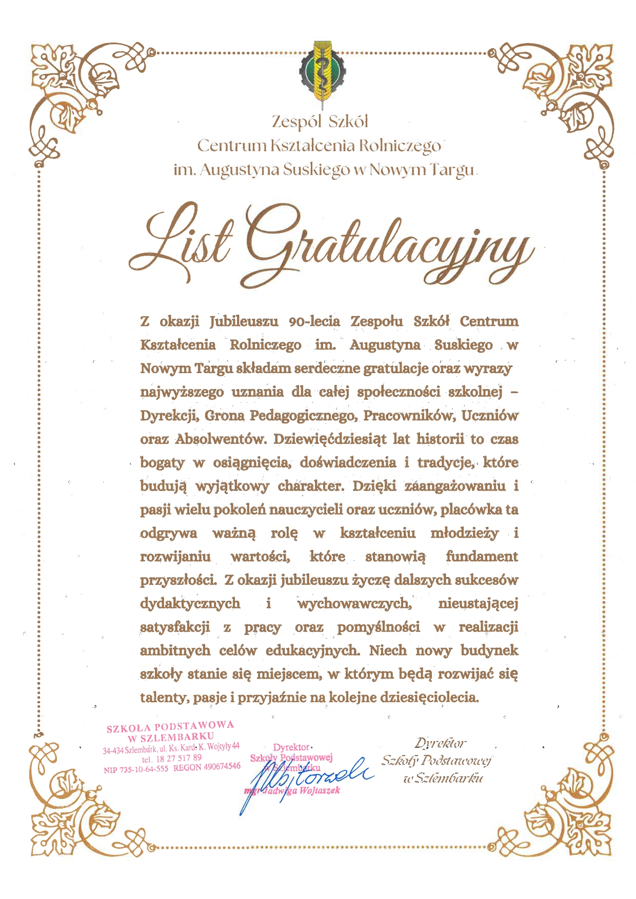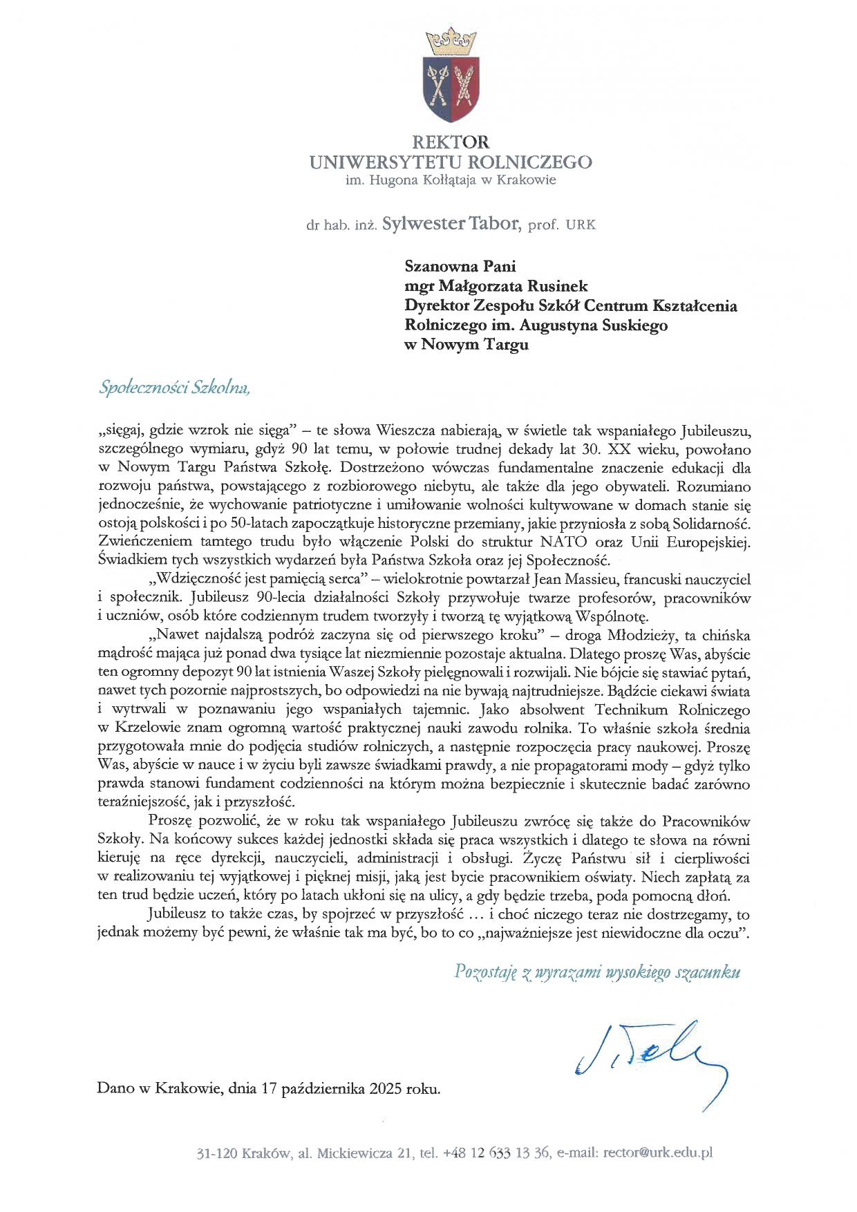 17 października br. w Zespole Szkół Centrum Kształcenia Rolniczego im. Augustyna Suskiego w Nowym Targu odbyła się wyjątkowa uroczystość – oficjalne otwarcie nowego budynku szkoły połączone z obchodami Jubileuszu 90-lecia jej istnienia. Był to niezwykle ważny i wzruszający dzień zarówno dla uczniów, nauczycieli, absolwentów, jak i całej lokalnej społeczności oraz przyjaciół szkoły.