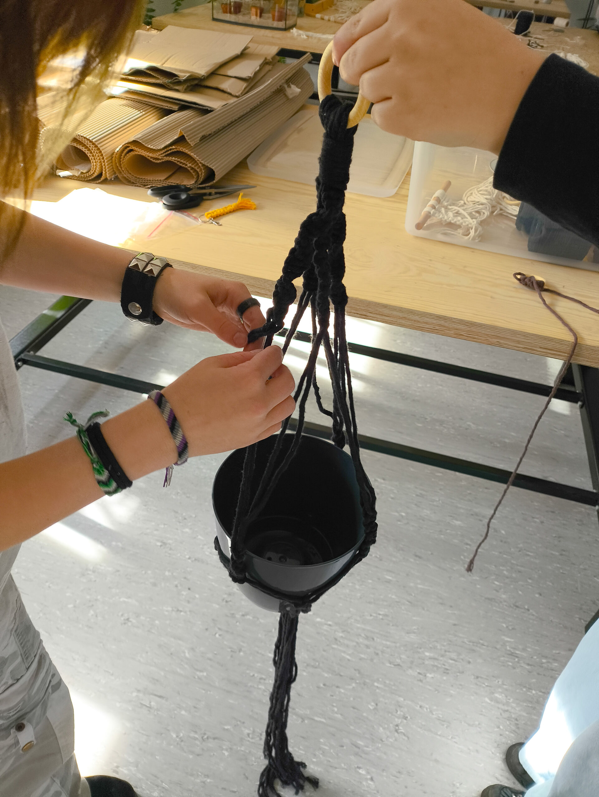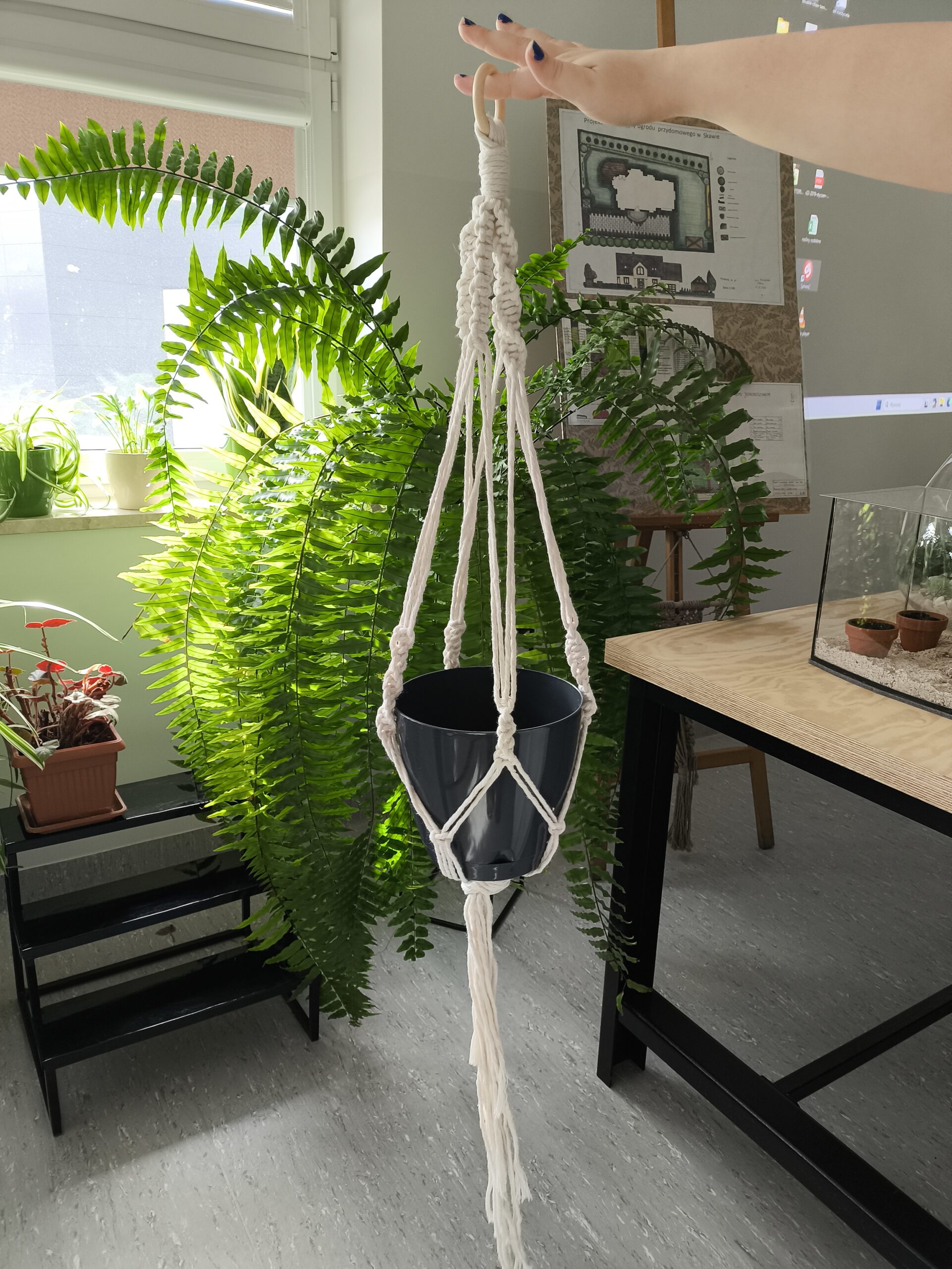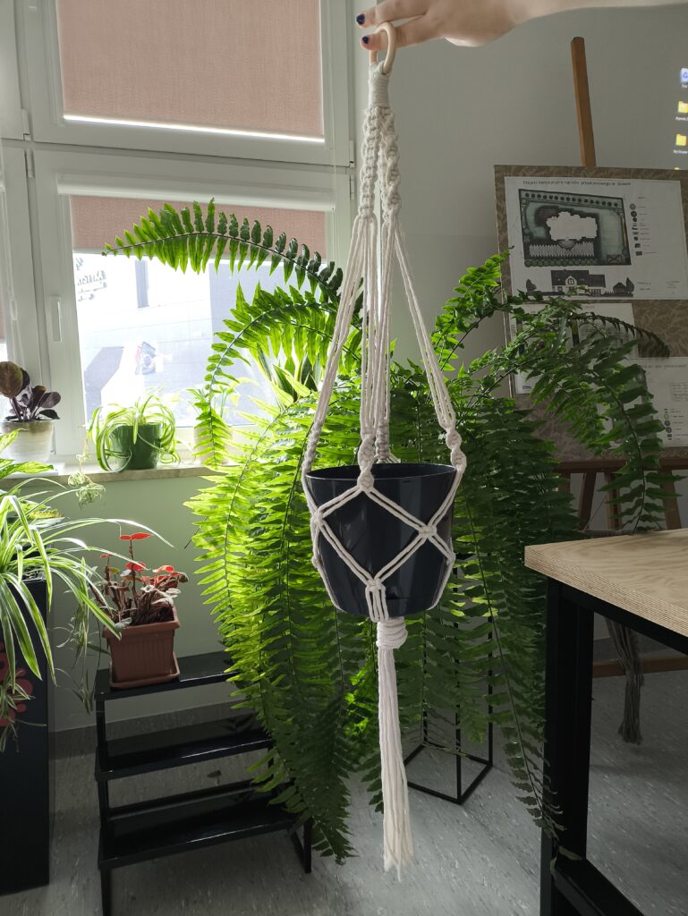 Podczas zajęć uczniowie poznali podstawowe węzły makramowe oraz samodzielnie wykonali baranki i wiszące kwietniki, które mogą stanowić element dekoracyjny tarasów, altan lub wnętrz. Zajęcia sprzyjały rozwijaniu zdolności manualnych, poczucia estetyki oraz kreatywności.