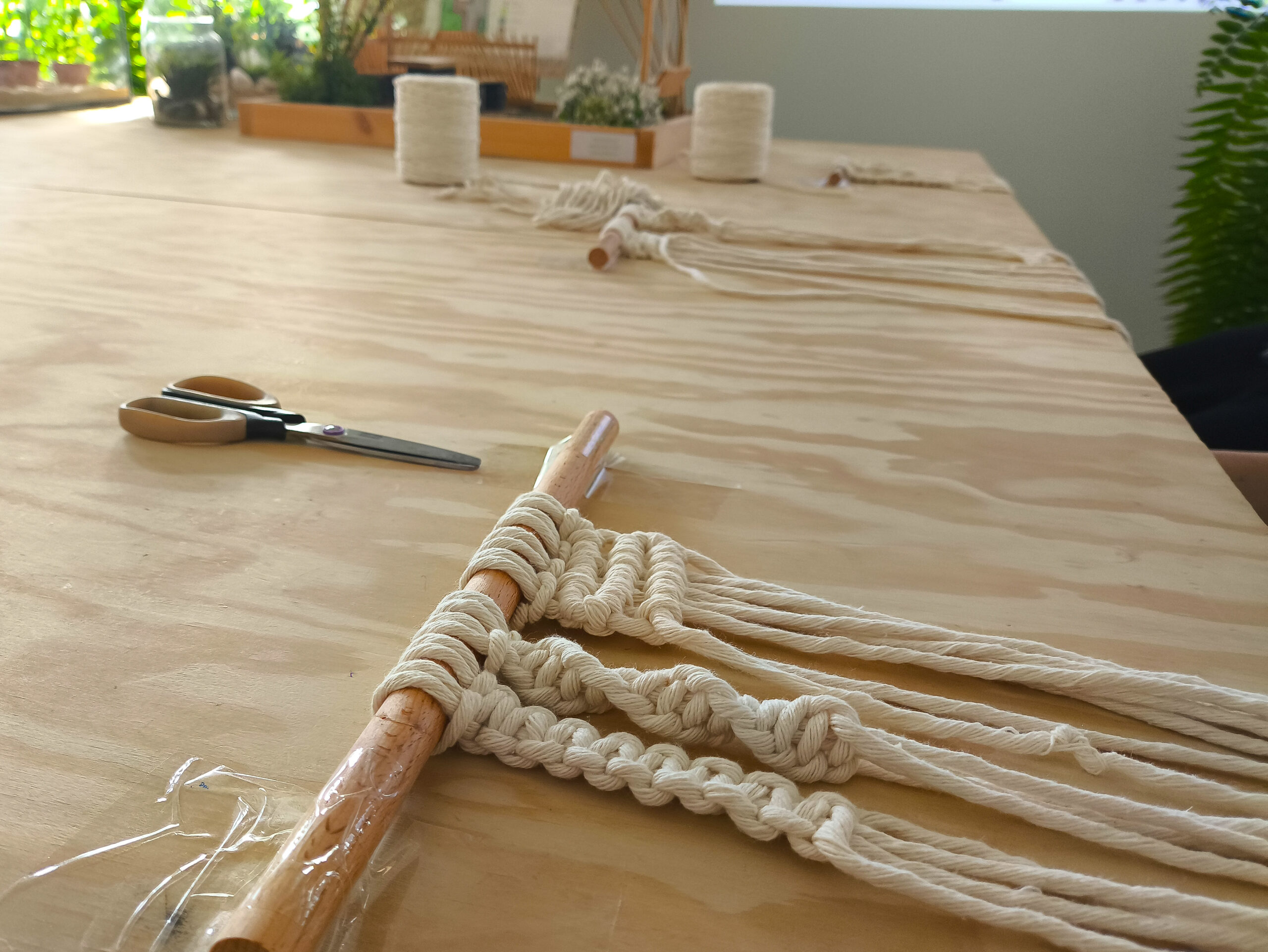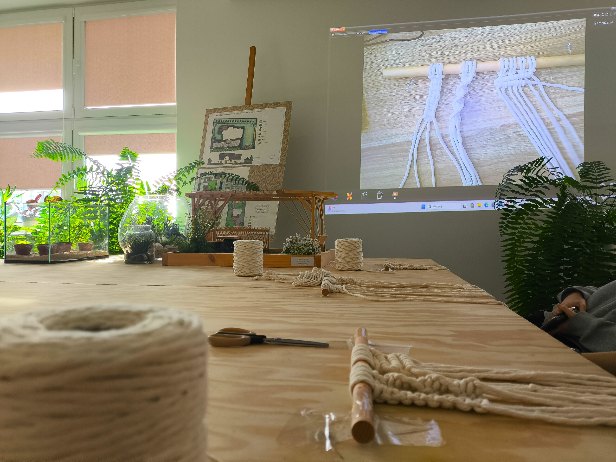 W dniu 20 lutego 2026 r. w pracowni Technikum Architektury Krajobrazu odbyły się warsztaty z makramy dla uczniów klasy I i II. Celem zajęć było zapoznanie uczestników z podstawowymi technikami wiązania sznurków oraz możliwościami wykorzystania makramy w aranżacji wnętrz i przestrzeni ogrodowych.