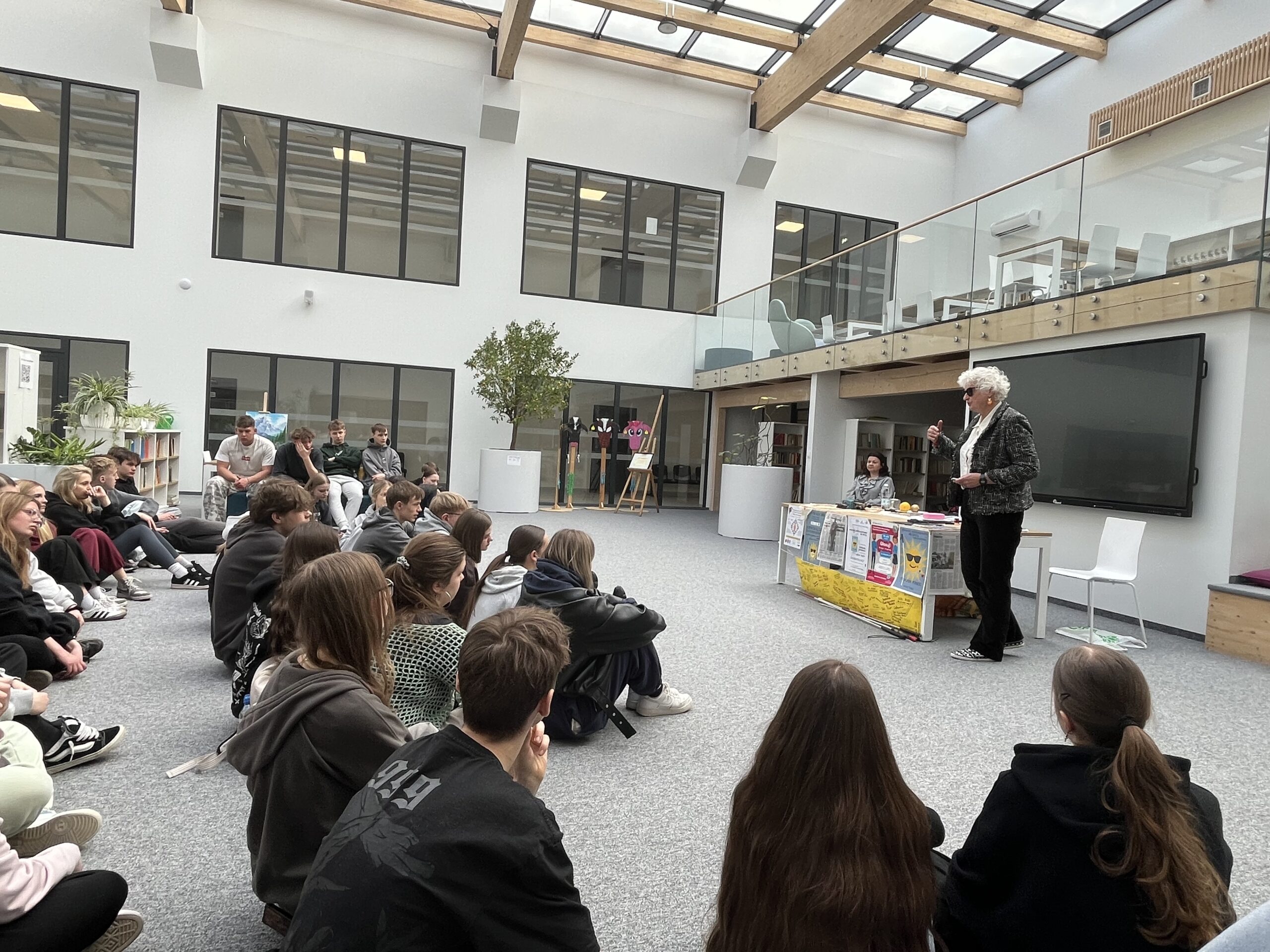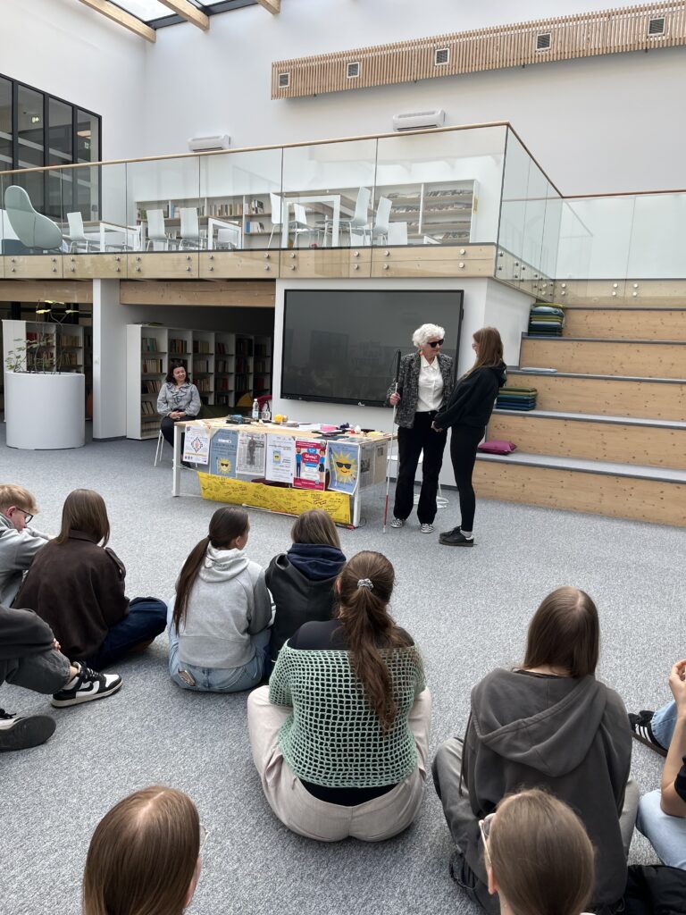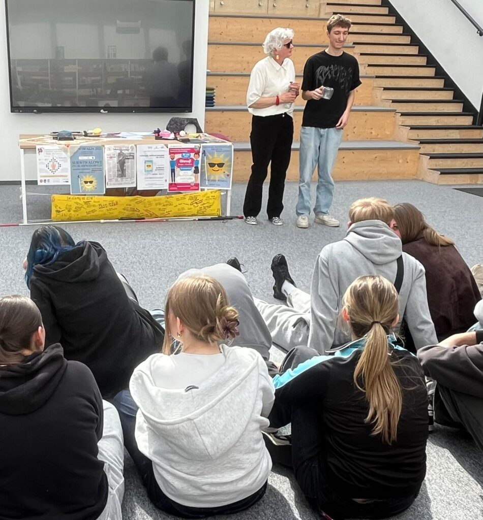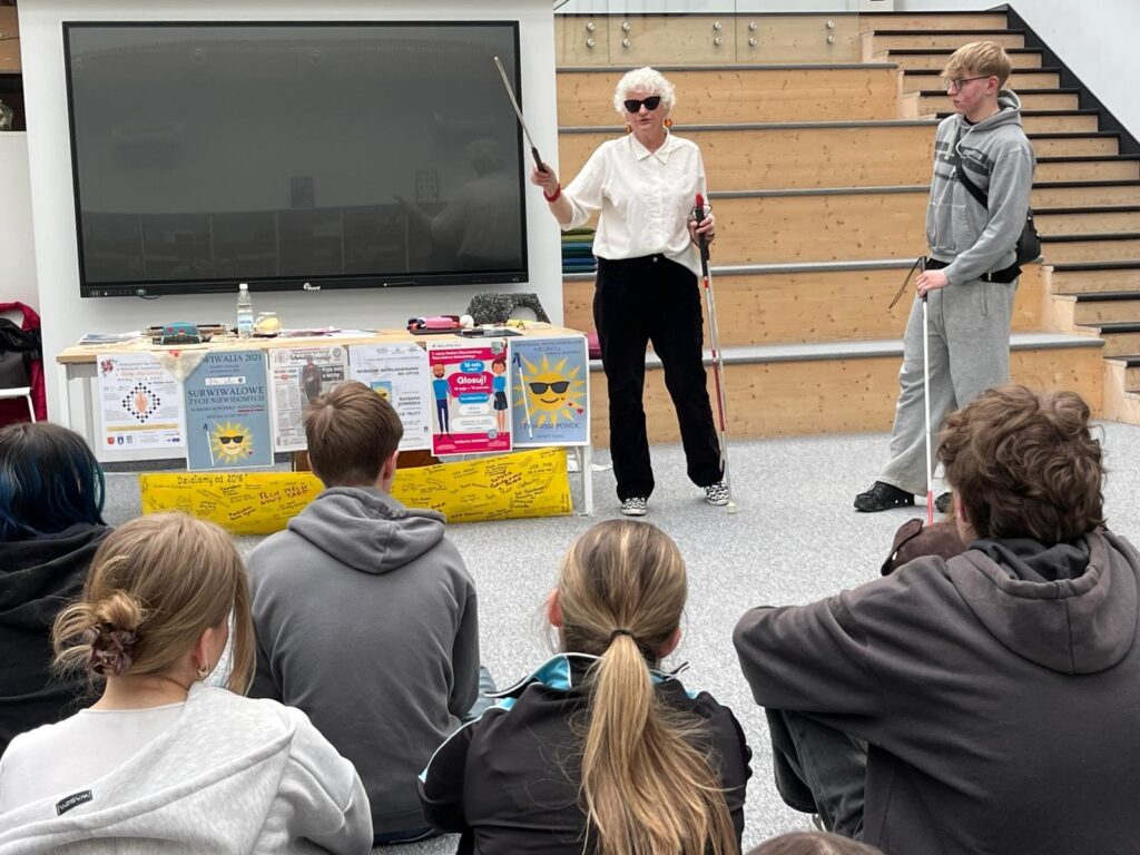 Warsztaty z panią Barbarą Sowińską dotyczyły funkcjonowania osób niewidomych oraz zasad właściwego zachowania w kontakcie z nimi. Prowadząca w przystępny i angażujący sposób opowiadała o codziennych doświadczeniach osób z dysfunkcją wzroku, zwracając szczególną uwagę na to, jak ważna jest empatia, uważność i szacunek.